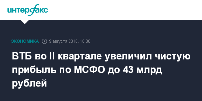 Москва. 9 августа. INTERFAX.RU - ВТБ во втором квартале увеличил чистую прибыль по МСФО по сравнению с аналогичным периодом прошлого года на 41,9%, до 43 млрд рублей, свидетельствует отчетность группы.