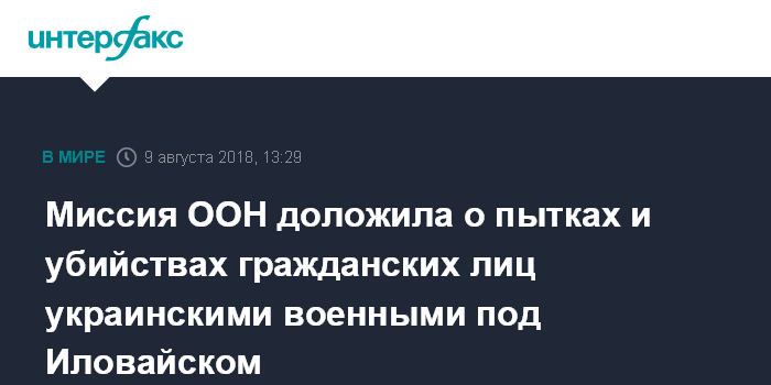 Москва. 9 августа. INTERFAX.RU - Мониторинговая миссия ООН по правам человека задокументировала факты убийства и пыток гражданских лиц во время событий под Иловайском (Донецкая обл.) украинскими военными в 2014 году, а также убийства и пыток украинских военнослужащих после того, как они сдались в плен.