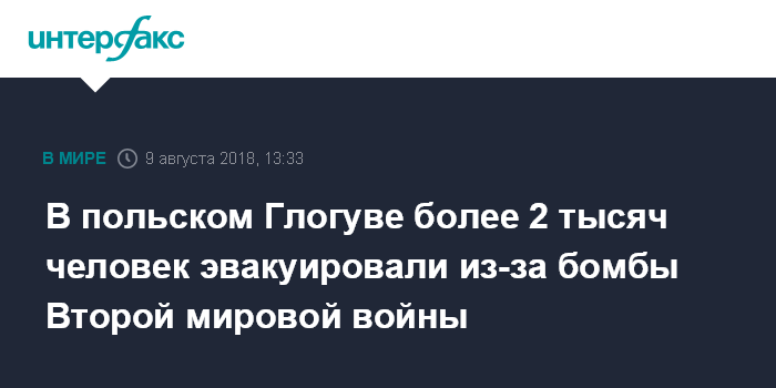 Москва. 9 августа. INTERFAX.RU - Экстренные службы эвакуировали от двух до трех тысяч человек в городе Глогув на западе Польши после того, как в черте города была обнаружена неразорвавшаяся бомба времен Второй мировой войны, передает АР.