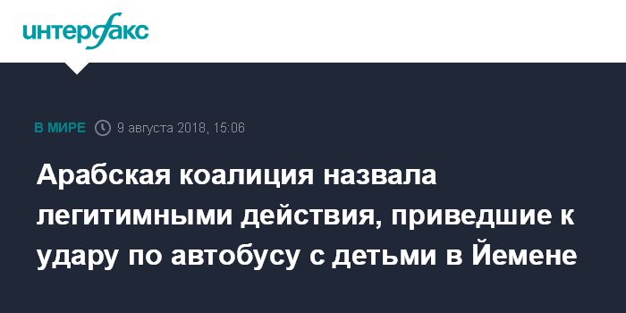 Москва. 9 августа. INTERFAX.RU - Возглавляемая Саудовской Аравией арабская коалиция после появления информации об авиаударе в Йемене по автобусу с гражданскими лицами обнародовала заявление в защиту своих действий, сообщают в четверг западные СМИ.