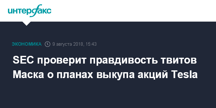 Москва. 9 августа. INTERFAX.RU - Комиссия по ценным бумагам и биржам (SEC) США намерена выяснить, насколько правдивым было заявление главы Tesla Илона Маска относительно его планов выкупить компанию и наличия соответствующего финансирования для этого, пишет газета The Wall Street Journal со ссылкой на осведомленные источники.