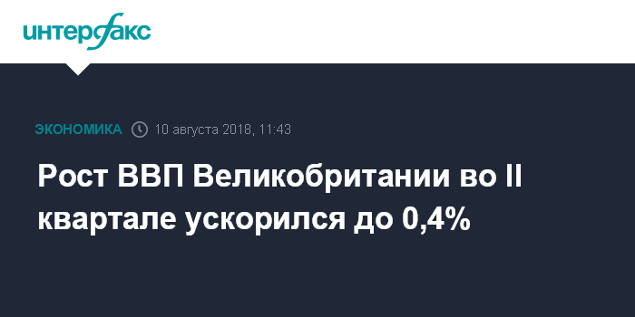 Москва. 10 августа. INTERFAX.RU - ВВП Великобритании во втором квартале 2018 года увеличился на 0,4% по сравнению с предыдущим кварталом. Об этом свидетельствуют предварительные данные Национального статистического управления (ONS).