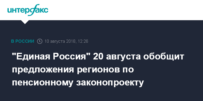 Москва. 10 августа. INTERFAX.RU - Через десять дней в "Единой России" обобщат предложения регионов по совершенствованию пенсионной системы в связи с рассмотрением в Госдуме правительственного законопроекта о повышении пенсионного возраста.