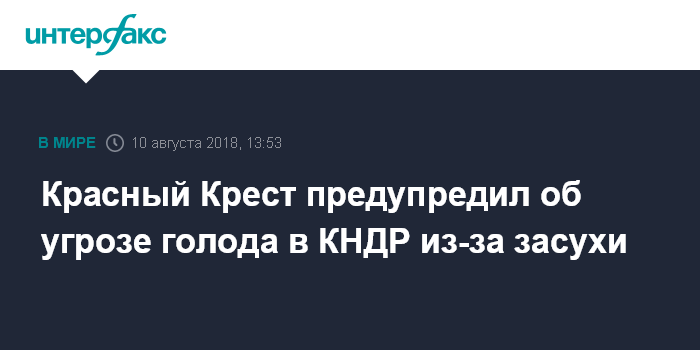 Москва. 10 августа. INTERFAX.RU - Аномально жаркая погода, установившаяся в КНДР, рискует вызвать в стране очередной продовольственный кризис и угрожает здоровью прежде всего детей и пожилых людей, предупредили в Международной федерации обществ Красного Креста и Красного Полумесяца.