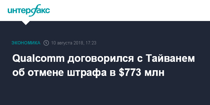Москва. 10 августа. INTERFAX.RU - Qualcomm достигла соглашения с властями Тайваня об отмене решения Комиссии по справедливой торговле, главного антимонопольного регулятора острова, которая в октябре 2017 года оштрафовала американского производителя чипов на 23,4 млрд новых тайваньских долларов ($773 млн).