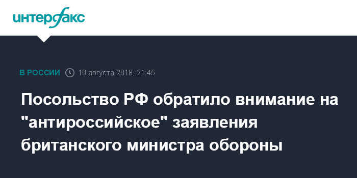 Москва. 10 августа. INTERFAX.RU - Посольство России в Лондоне считает воинственной риторику министра обороны Соединенного Королевства Гэвина Уильямсона, заявившего о готовности Великобритании к применению силы в различных районах мира.