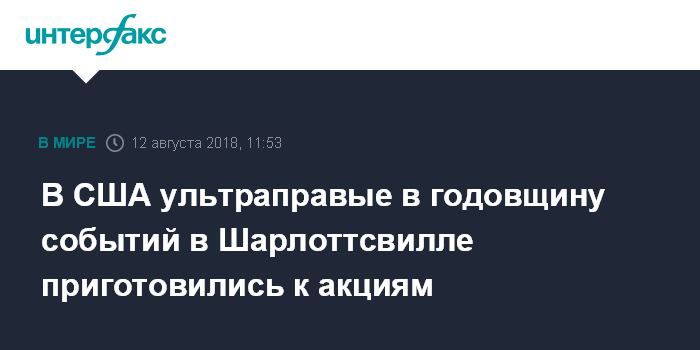 Москва. 12 августа. INTERFAX.RU - Сторонники ультраправых и их оппоненты в воскресенье - в годовщину всплеска насилия в Шарлоттсвилле (штат Вирджиния) - собираются выйти на демонстрации в Вашингтоне, к Белому дому, сообщает издание The Hill.