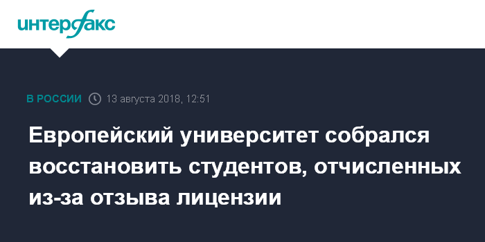 Москва. 13 августа. INTERFAX.RU - Европейский университет в скором времени планирует восстановить студентов, отчисленных из вуза в 2017 году после отзыва лицензии, сообщили "Интерфаксу" в вузе в понедельник.