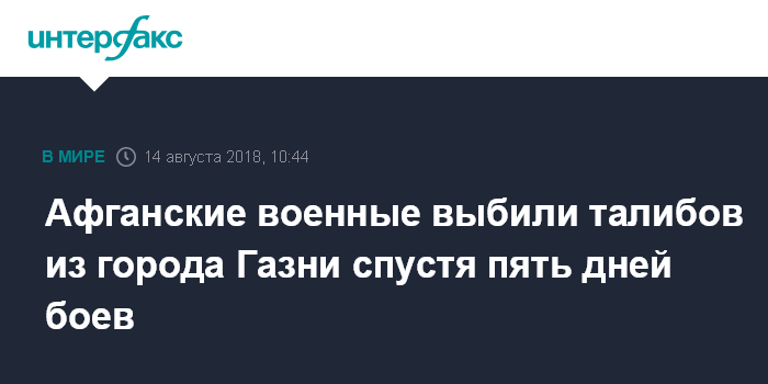 Москва. 14 августа. INTERFAX.RU - Власти Афганистана заявили во вторник, что силам безопасности после пяти дней ожесточенных боев удалось выбить боевиков группировки "Талибан" (запрещена в РФ) из города Газни - столицы одноименной афганской провинции в 75 км к юго-западу от Кабула, сообщает Associated Press.