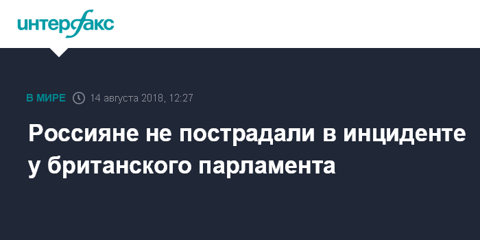 Москва. 14 августа. INTERFAX.RU - Россияне не пострадали в результате наезда автомобиля на ограждение около британского парламента в Лондоне, сообщили во вторник в посольстве России в Великобритании.