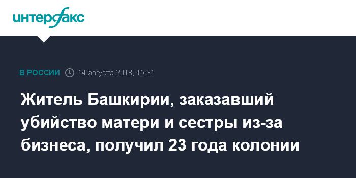 Москва. 14 августа. INTERFAX.RU - Верховный суд Башкирии вынес приговор жителю Сибая по обвинению в организации убийства своей матери и сестры, сообщила во вторник пресс-служба СУ СКР по республике.