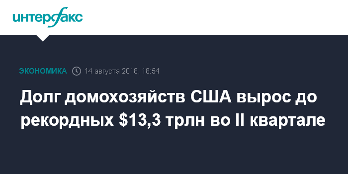 Москва. 14 августа. INTERFAX.RU - Совокупная сумма задолженности домохозяйств США за второй квартал 2018 года выросла на 3,5%, или на $82 млрд, и составила рекордные в истории $13,3 трлн, говорится в исследовании Федерального резервного банка (ФРБ) Нью-Йорка.