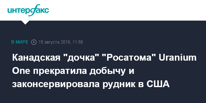Москва. 15 августа. INTERFAX.RU - Канадская уранодобывающая корпорация Uranium One Inc (входит в ГК "Росатом") 9 июля 2018 года прекратила добычу на руднике Willow Creek в штате Вайоминг в США в рамках перевода объекта в режим консервации, сообщается в отчете U1.