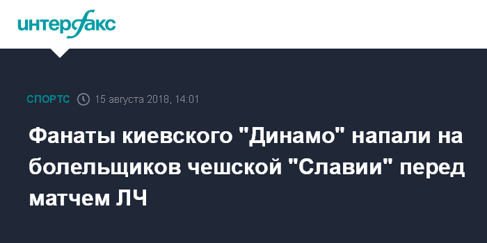 Москва. 15 августа. INTERFAX.RU - Фанаты киевского "Динамо" избили и отобрали атрибутику у болельщиков пражской "Славии" перед ответным матчем 3-го квалификационного раунда Лиги чемпионов УЕФА в столице Украины, сообщается на официальной странице поклонников украинской команды Troublemakers & Ultras Action в социальной сети "Вконтакте".