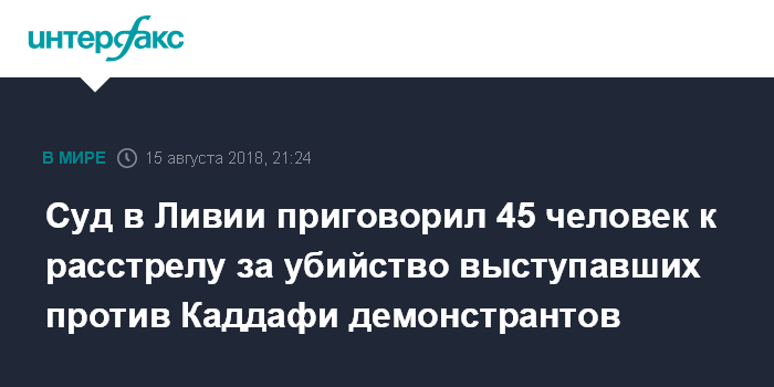 Москва. 15 августа. INTERFAX.RU - Ливийский суд в среду вынес смертный приговор 45 полицейским, открывшим огонь по демонстрантам в Триполи в 2011 году во время массовых беспорядков против тогдашнего лидера страны Муаммара Каддафи, сообщает министерство юстиции Ливии.