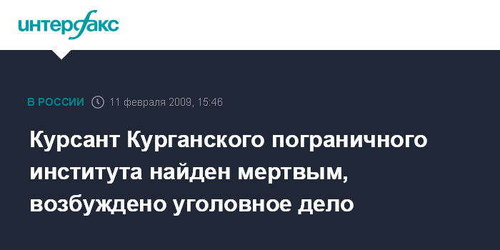 Москва. 11 февраля. INTERFAX.RU - На территории Курганского пограничного института во вторник один из курсантов был найден мертвым.