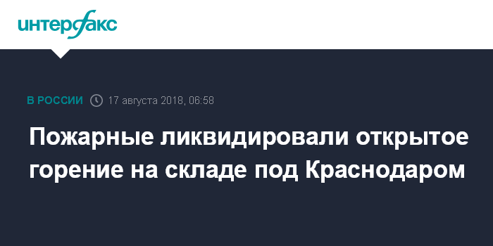 Москва. 17 августа. INTERFAX.RU - Ликвидация открытого горения объявлена на месте тушения пожара на складе в городе Тимашевске в Краснодарском крае, сообщили "Интерфаксу" в ситуационном центре Единой дежурно-диспетчерской службы Тимашевского района.