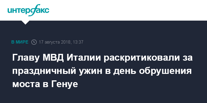 Москва. 17 августа. INTERFAX.RU - Итальянцы подвергли критике поведение министра внутренних дел страны Маттео Сальвини в день обрушения виадука в Генуе, сообщают в пятницу европейские СМИ.