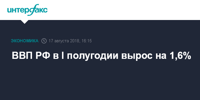Москва. 17 августа. INTERFAX.RU - ВВП РФ в I полугодии 2018 года увеличился по сравнению с аналогичным периодом прошлого года на 1,6%. Такую оценку распространила в пятницу Федеральная служба государственной статистики (Росстат).