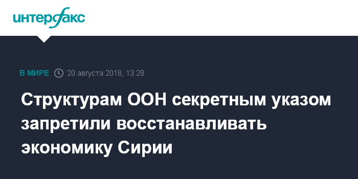 "Политический департамент секретариата ООН ещё в октябре прошлого года издал и распространил по всей системе ООН секретную директиву, запрещающую организациям, входящим в эту систему, участвовать в каких-либо проектах по восстановлению сирийской экономики. Только гуманитарная помощь, больше ничего", - сказал Лавров.