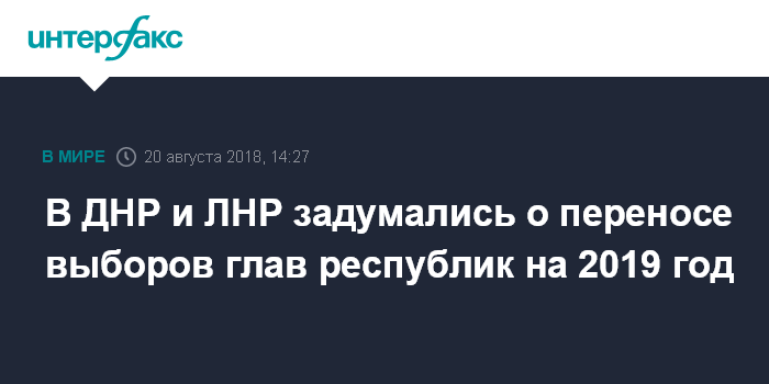 Москва. 20 августа. INTERFAX.RU - Выборы глав самопровозглашенных Донецкой и Луганской народных республик, намеченные на ноябрь нынешнего года, могут перенести на 2019 год.