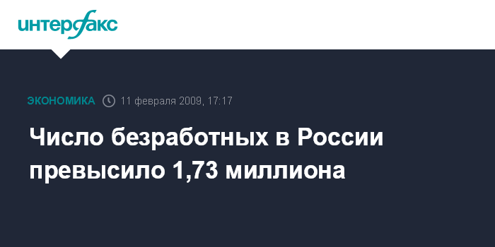 Москва. 11 февраля. INTERFAX.RU - Количество безработных в РФ на 4 февраля превысило 1,7 млн человек, увеличившись за неделю на 90 тысяч, заявил в среду вице-премьер Александр Жуков на совещании по мониторингу ситуации на рынке труда.
