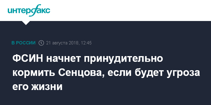 Москва. 21 августа. INTERFAX.RU - ФСИН начнет принудительно кормить проводящего голодовку осужденного за терроризм режиссера Олега Сенцова, если его отказ от пищи будет угрожать его жизни, сообщил "Интерфаксу" ответственный секретарь Общественной наблюдательной комиссии Москвы Иван Мельников.
