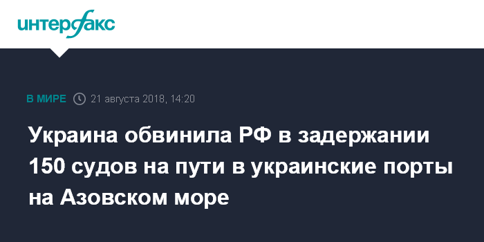 Москва. 21 августа. INTERFAX.RU - Российская сторона задержала более 150 иностранных судов, следовавших в украинские порты на Азовском море, заявил помощник главы Госпогранслужбы Украины Олег Слободян.