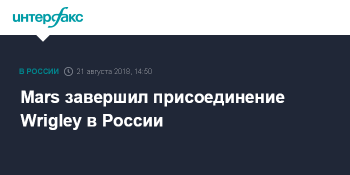 Москва. 21 августа. INTERFAX.RU - Компания Mars в России завершила присоединение ООО "Ригли" в рамках единого сегмента "Mars Wrigley Кондитерские изделия", в состав которого вошли подразделения Mars Chocolate и Wrigley.