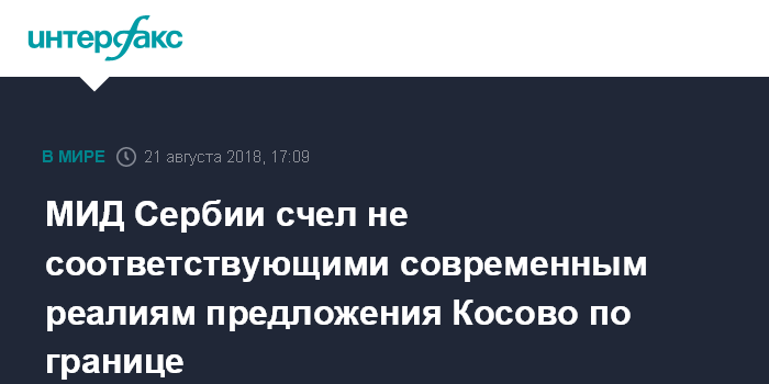 Москва. 21 августа. INTERFAX.RU - Предложения руководства Косово по границе с Сербией не соответствуют современным реалиям, они никогда не будут претворены в жизнь, заявил глава МИД Сербии Ивица Дачич.