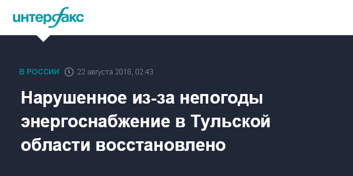 "Последними завершены восстановительные работы в Веневском районе. Ранее энергетики восстановили энергоснабжение в городских округах Тула и Новомосковск", - сказал собеседник агентства.