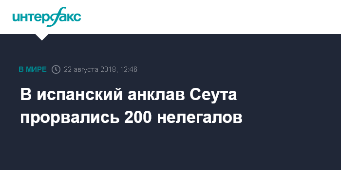 Москва. 22 августа. INTERFAX.RU - Около 200 нелегалов из стран тропической Африки в среду прорвались на территорию испанского анклава Сеута, расположенного на севере Африки, сообщает сайт испанской газеты El Pais.