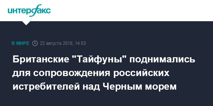 Москва. 22 августа. INTERFAX.RU - Два истребителя "Тайфун" Королевских ВВС Великобритании вылетали с базы "Михаил Когалничан" для сопровождения двух российских многоцелевых истребителей Су-30 над акваторией Черного моря, сообщает в среду британская газета Daily Express, которая приводит выдержки из сообщения британских ВВС.
