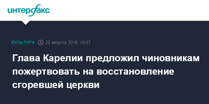 Москва. 23 августа. INTERFAX.RU - Глава республики Карелия Артур Парфенчиков предложил чиновникам пожертвовать свой однодневный заработок на восстановление сгоревшей в Кондопоге Успенской церкви, сообщила пресс-служба правительства региона.