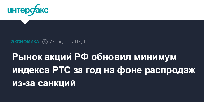 Москва. 23 августа. INTERFAX.RU - Рынок акций РФ в четверг обновил минимум индекса РТС за год (на закрытие торгов) под давлением распродаж из-за грядущих антироссийских санкций США; лидерами отката выступили бумаги Сбербанка и ВТБ .