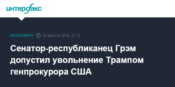 Москва. 23 августа. INTERFAX.RU - Американский сенатор-республиканец Линдси Грэм считает "очень вероятным", что президент США Дональд Трамп уволит генпрокурора США Джеффа Сешнса, передает в четверг агентство Bloomberg.