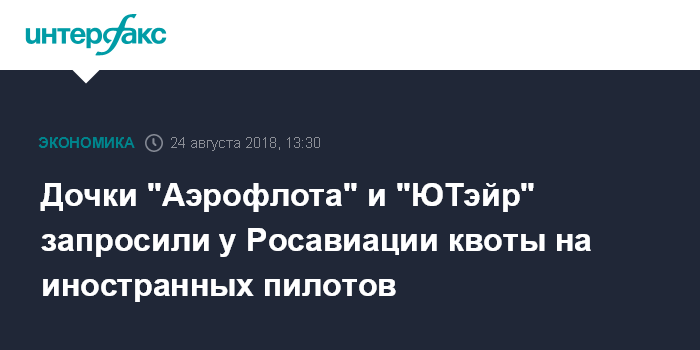 Москва. 24 августа. INTERFAX.RU - Входящие в группу "Аэрофлот" авиакомпании "Россия" и "Победа", а также "ЮТэйр" и "ЮТэйр - Вертолетные услуги" запросили у Росавиации квоты на прием иностранных пилотов, говорится в сообщении ведомства.