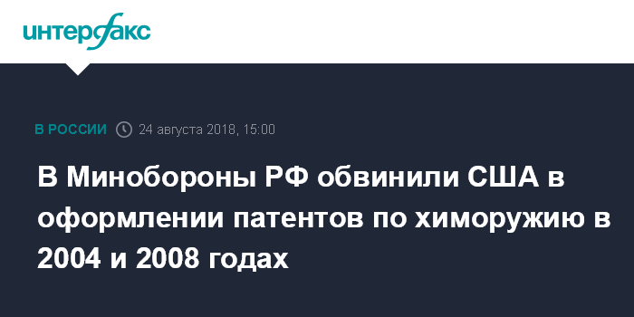 Москва. 24 августа. INTERFAX.RU - Патенты, связанные с разработками химического оружия, регистрировались в Соединенных Штатах даже после вступления в силу Конвенции о его запрете. Об этом заявил начальник войск радиационной, химической и биологической защиты (РХБЗ) Вооруженных сил РФ Игорь Кириллов.