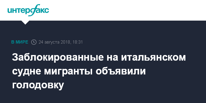 Москва. 24 августа. INTERFAX.RU - Находящиеся на борту судна Diciotti у итальянских берегов иммигранты объявили о голодовке. Об этом сообщил в пятницу замглавы Минздрава Италии Давиде Фараоне.
