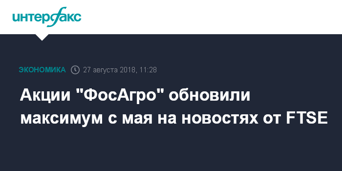 Москва. 27 августа. INTERFAX.RU - Акции "ФосАгро" утром в понедельник обновили максимум с мая после известий, что индексный провайдер FTSE по итогам полугодового пересмотра заменил глобальные депозитарные расписки (GDR) "ФосАгро" на локальные акции.