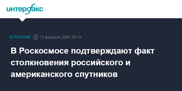 Москва. 12 февраля. INTERFAX.RU - В Роскосмосе подтвердили факт столкновения на орбите российского и американского спутников. "Факт столкновения зафиксирован, но конкретных комментариев мы пока дать не можем", - сказали "Интерфаксу-АВН" в четверг в пресс-службе Роскосмоса.