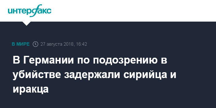 Москва. 27 августа. INTERFAX.RU - В прокуратуре немецкого города Хемниц (федеральная земля Саксония) сообщили о задержании 23-летнего сирийца и 22-летнего иракца по подозрению в убийстве гражданина Германии, подтвердили "Интерфаксу" в местной прокуратуре.