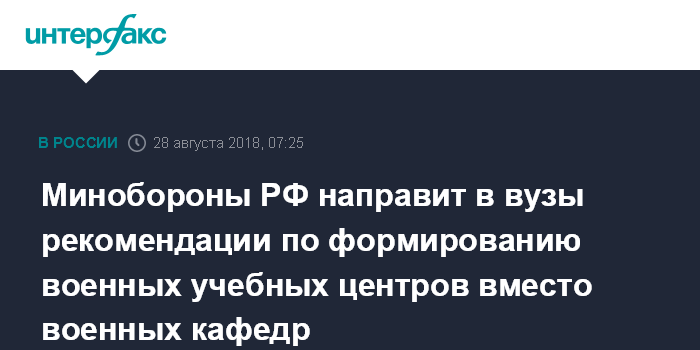 "Для своевременного перехода от существующих ныне структур военной подготовки уже сейчас необходимо приступить к разработке... проектов организационных структур и штатных расписаний создаваемых военных учебных центров. Мы готовы предложить основные подходы к формированию новых организационных структур, понимая, что такая работа должна строиться исходя из единых принципов. Соответствующие методические рекомендации будут разработаны в ближайшее время и направлены во все вузы", - сказал замглавы Минобороны РФ.