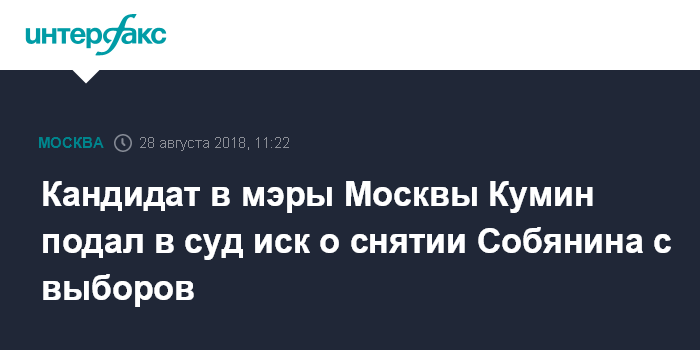 Кумин, поясняя свою позицию по поданному иску, заявил, что считает несправедливым более частое по сравнению с другими претендентами на пост мэра Москвы появление Собянина в публикациях СМИ.