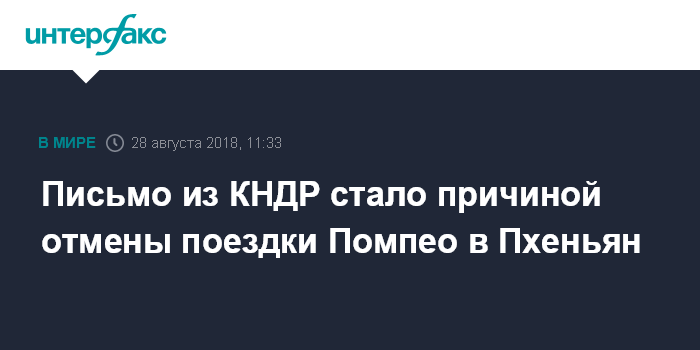 Москва. 28 августа. INTERFAX.RU - Причиной отмены визита госсекретаря США Майкла Помпео в КНДР, запланированного на эту неделю, стало письмо зампреда ЦК Трудовой партии Северной Кореи Ким Ён Чхоля. Об этом сообщает во вторник газета The Washington Post со ссылкой на два неназванных источника в администрации США.