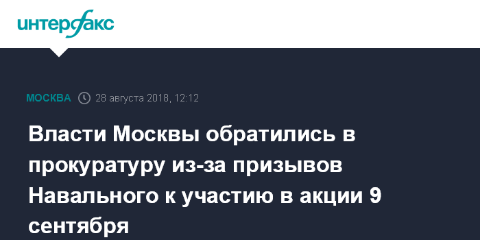 Москва. 28 августа. INTERFAX.RU - Столичные власти обратились в прокуратуру города в связи с призывами сторонников оппозиционера Алексея Навального к участию в несанкционированной акции 9 сентября в центре Москвы.