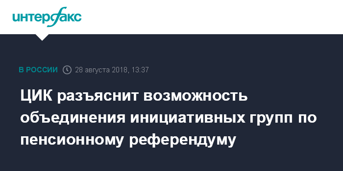 Москва. 28 августа. INTERFAX.RU - Центризбирком на заседании в среду даст разъяснения относительно возможности объединения инициативных групп по проведению всероссийского референдума по повышению пенсионного возраста, сообщила "Интерфаксу" секретарь ЦИК России Майя Гришина.