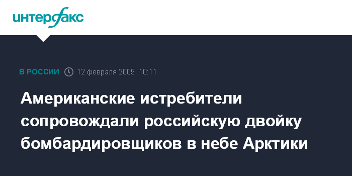 "Маршрут полета проходил через нейтральные воды Северного Ледовитого океана в районе Алеутских островов. Экипажи Дальней авиации успешно выполнили задачу по воздушному патрулированию, проведя в воздухе более 12 часов. На маршруте полета экипажи Дальней авиации сопровождались самолетами НАТО - истребителями F-15", - сообщил "Интерфаксу-АВН" в четверг помощник командующего ВВС РФ подполковник Владимир Дрик.
