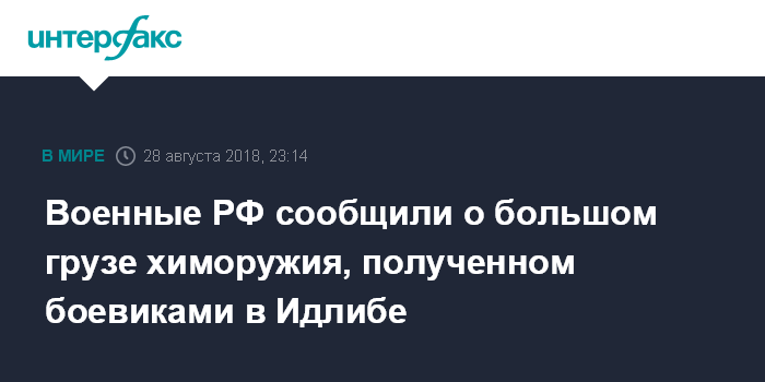 Москва. 28 августа. INTERFAX.RU - Боевики в сирийской провинции Идлиб получили отравляющие вещества для инсценировки химической атаки, в которой предполагается обвинить сирийские власти, сообщил начальник российского центра по примирению враждующих сторон в Сирии генерал-майор Алексей Цыганков.