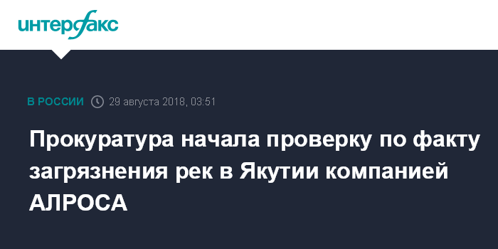 Москва. 29 августа. INTERFAX.RU - Проводится проверка по факту загрязнения рек Ирелях, Малая Ботуобуйа, Вилюй в результате прорыва дамб на дражных полигонах месторождения "Иреляхская россыпь", принадлежащего АЛРОСА, сообщает пресс-служба прокуратуры Якутии.
